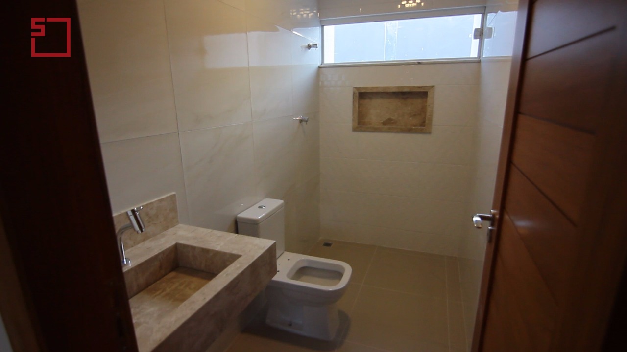 - – Bancadas dos banheiros com cubas esculpidas em travertino;